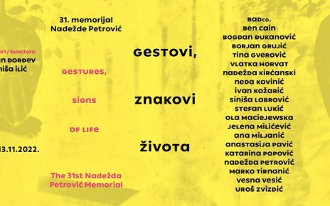 Umetnička galerija „Nadežda Petrović“, Čačak 31. Memorijal Nadežde Petrović „Gestovi, znakovi života“ priređuje od 1. oktobra do 13. novembra. Svečano otvaranje Memorijala biće u subotu, 1. oktobra, u 16 časova, u Umetničkoj galeriji ,,Nadežda Petrović“. Saopštenje Umetničke galerije „Nadežda Petrović“ Svedočimo vremenu koje iz dana u dan oblikuju zdravstvena kriza, krhkost tela i imperativi fizičkog […]