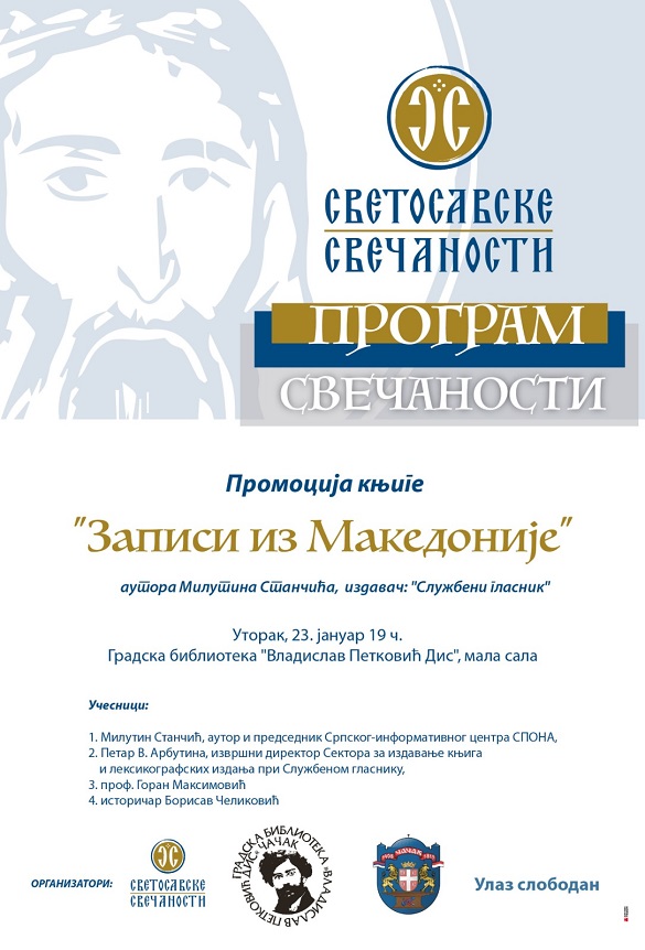 У уторак, 23. јануара, у Малој сали Градске библиотеке, посетиоце очекује промоција књиге „Записи из Македонијеˮ у реализацији аутора и председника Српског информативног центра СПОНА Милутина Станчића, извршног директора при „Службеном гласникуˮ Петра В. Арбутине, професора Горана Максимовића и историчара Борисава Челиковића.
