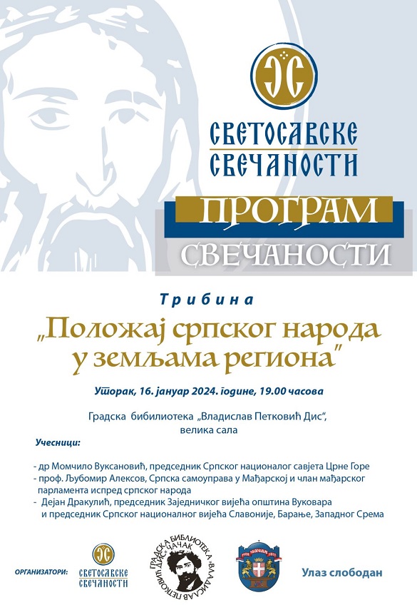 Најпре ће, у уторак, 16. јануара, у 19.00 часова, у Великој сали Градске библиотеке, посетиоци моћи да присуствују трибини под називом „Положај српског народа у земљама регионаˮ на којој учествују др Момчило Вуксановић, председник Српског националног савјета Црне Горе, проф. Љубомир Алексов, члан мађарског парламента испред српског народа и Српске самоуправе у Мађарској, као и Дејан Дракулић, председник Заједничког вијећа општина Вуковара и Српског националног вијећа Славоније, Барање и Западног Срема.