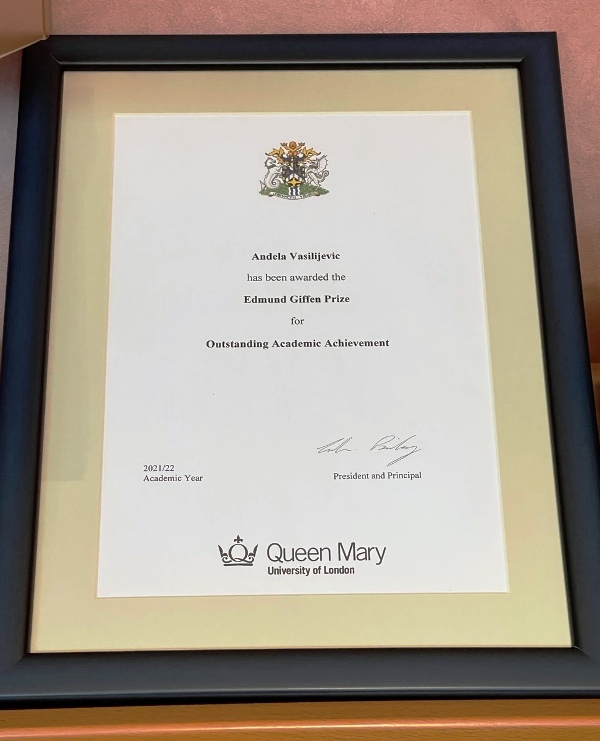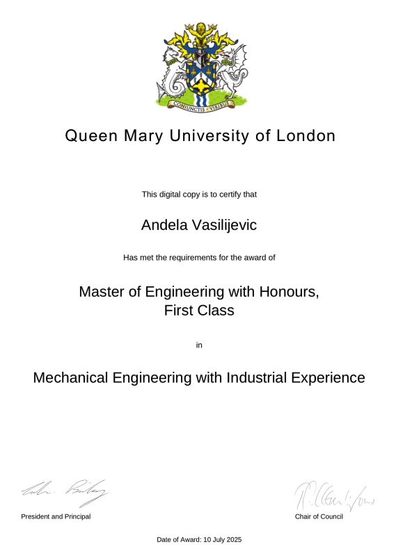 Млада, амбициозна и успешна девојка Анђела Василијевић је рођена 2001. године у Чачку. Колико знања, образовања и животног искуства је стало у њених 24 године тешко је обухватити једним разговором. Вредна, талентована, одговорна, жели најбоље и најбоље даје од себе. Воли успех и бори се за њега. Дипломирала је и магистрирала на престижном „Queen Mary” Универзитету у Лондону, 28. јула ове године, и после само неколико дана, спаковала је својих пет година живота у Британији и вратила се у родни град. На њеној дипломи пише – Мастер машинског инжењеринга са индустријским искуством. Просек оцена из свих предмета је 98,75! Половину школарине имала је као стипендиста „Queen Mary” Универзитета. На свакој години студија била је проглашена за најбољег студента, а током школовања добила је осам различитих награда од Универзитета, али и награду једне британске компаније, јер је проглашена најбољим студентом генерације.