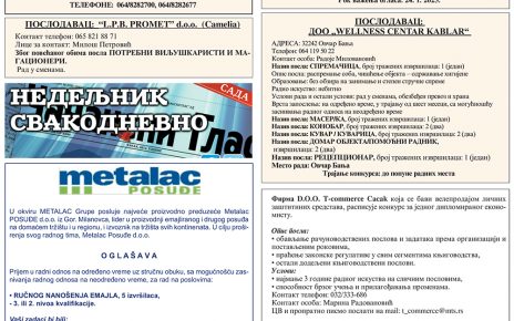 ПОСЛОДАВАЦ: „NEVA DIMI EXIM“ АДРЕСА: Београд, Звездара, Старца Вујадина 13 Чачак, Милоша Обилића 78 Телефон: 069/880-72-22 Е-mail: slavica.c0201@gmail.com Лице за контакт: Славица Цветић Назив посла: КОМЕРЦИЈАЛИСТА НА ТЕРЕНУ Број тражених извршилаца: 3 (три) Oпис посла: комерцијалиста на терену за продају малих кућних апарата и посуђа Образовање: IV степен стручне спреме, […]