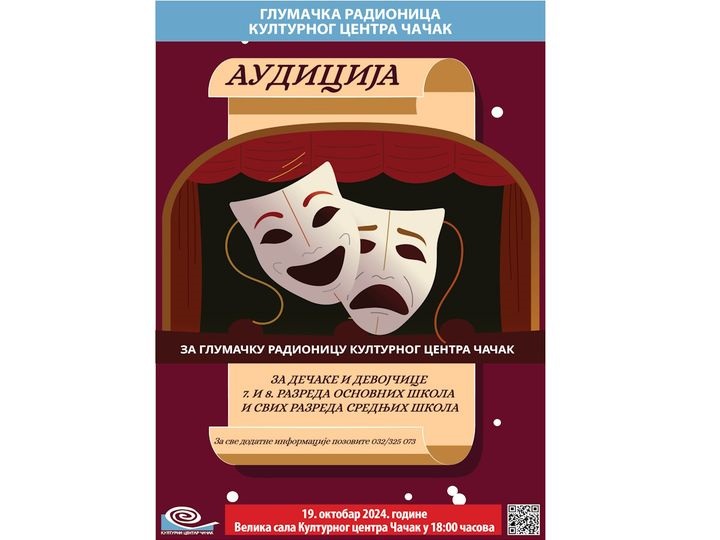 Културни центар Чачак организује АУДИЦИЈУ за нове чланове Глумачке радионице.Аудиција ће бити одржана у суботу, 19. октобра 2024. године у 18 часова у Великој сали.За аудицију је потребно припремити монолог и рецитацију, а могу се пријавити сви заинтересовани узраста од 13 до 18 година.Информације на телефон: 032/325-073, локал 107 и 064/80-40-262.