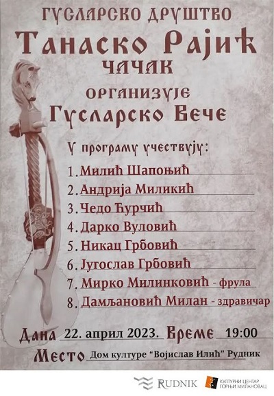 Гусларско друштво „Танаско Рајић” из Чачка уз подршку компаније “Рудник и флотација – Рудник” и Културног центра Горњи Милановац организује у суботу, 22. априла 2023. године у Дому културе „Војислав Илић” на Руднику гусларско вече. Почетак гусларске вечери је у 19 часова. У програму ће наступити Милан Шапоњић, Андрија Миликић, Чедо Ћурчић, Дарко Вуловић, Никац […]