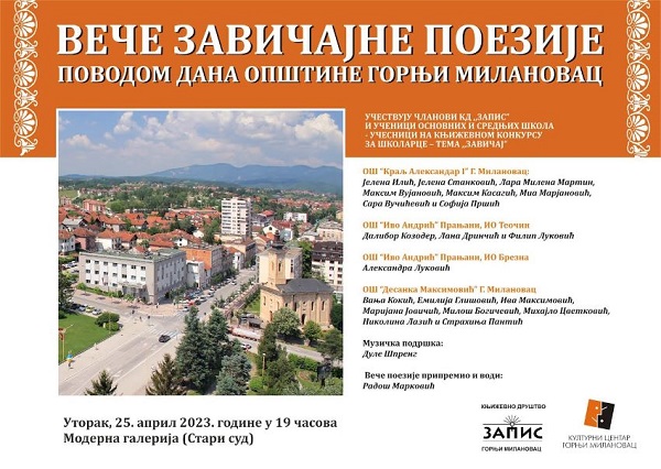 Поводом Дана општине Горњи Милановац књижевно друштво „Запис“ уз подршку Културног центра организује у уторак, 25. априла 2023. године у Модерној галерији вече завичајне поезије. У програму ће наступити чланови удружења и ученици основних и средњих школа – учесници књижевног конкурса – тема „Завичај“. Почетак програма је у 19 сати. Извор: Културни центар Горњи Милановац