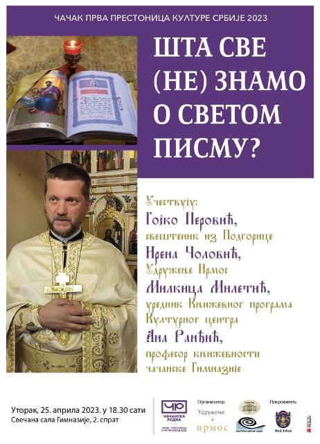 У оквиру низа манифестација и програма године у којој је Чачак прва престоница културе Србије, Удружење „Ирмос“ организује трибину у којој ће гост бити чувени свештеник из Подгорице Гојко Перовић! „Шта све (не) знамо о „Светом писму“ “ је програм који ће бити одржан у уторак, 25. априла, у 18.30 часова, у Свечаној сали Гимназије. […]