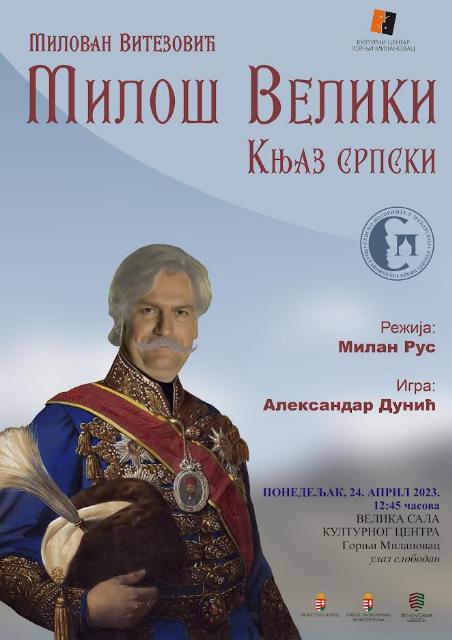 Александар Дуњић, глумац Позоришта на Теразијама у понедељак, 24. априла 2023, у 12.45 часова, у оквиру обележавања Дана општине Горњи Милановац и 170 година постојања града, на великој сцени Културног центра извешће монодраму: „Милош Велики – Књаз Српски“. Представу је на сцену поставио Милан Рус, редитељ, а аутор текста је Милован Витезовић. Монодрама: „Милош Велики […]