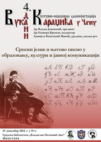 „Језик и његово писмо у образовању, култури и јавној комуникацији” је предавање др Владана Јовановића (Институт за српски језик САНУ) које ће бити одржано у уторак, 19. новембар у 19 ч, у Малој сали Градске библиотеке Скуп се одржава поводом манифестације ,,Дани Вука Караџића“ у организацији Удружења ,,Чувари дела Вука Караџића“. Модератор програма је др […]