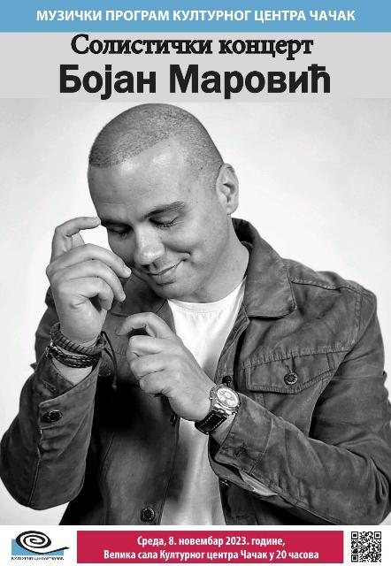 У среду, 8. новембра, у 20.00, одржаће се солистички концерт певача Бојана Маровића пред чачанском публиком! Велика сала Културног центра биће отворена за све љубитеље Маровићевих песама! Бесплатне улазнице суграђани могу преузети на билетарници Културног центра Чачак од понедељка 30. октобра. Организација: Музички програм Културног центра Чачак.