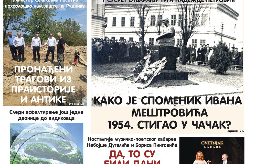 • Следи асфалтирање још једне деонице до видиковца – НАШ ЈЕ НАЈЛЕПШИ! • У СУСРЕТ ОТВАРАЊУ ТРГА НАДЕЖДЕ ПЕТРОВИЋ – КАКО ЈЕ СПОМЕНИК ИВАНА МЕШТРОВИЋА 1954. СТИГАО У ЧАЧАК • Носталгије музичко-поетског кабареа Небојше Дугалића и Бориса Пинговића – ДА, ТО СУ БИЛИ ДАНИ • Министар Селаковић посетио археолошко налазиште на Руднику – ПРОНАЂЕНИ ТРАГОВИ […]