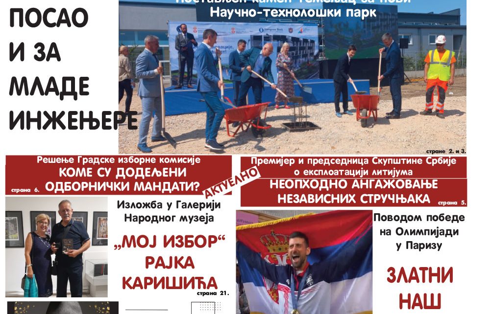 Постављен камен темељац за нови Научно-технолошки парк ПОСАО И ЗА МЛАДЕ ИНЖЕЊЕРЕ Премијер и председница Скупштине Србије о експлоатацији литијума НЕОПХОДНО АНГАЖОВАЊЕ НЕЗАВИСНИХ СТРУЧЊАКА Решење Градске изборне комисије КОМЕ СУ ДОДЕЉЕНИ ОДБОРНИЧКИ МАНДАТИ? Поводом победе на Олимпијади у Паризу ЗЛАТНИ НАШ НООЛЕЕ!!! Изложба у Галерији Народног музеја „МОЈ ИЗБОР“ РАЈКА КАРИШИЋА Министар Томислав Момировић посетио […]