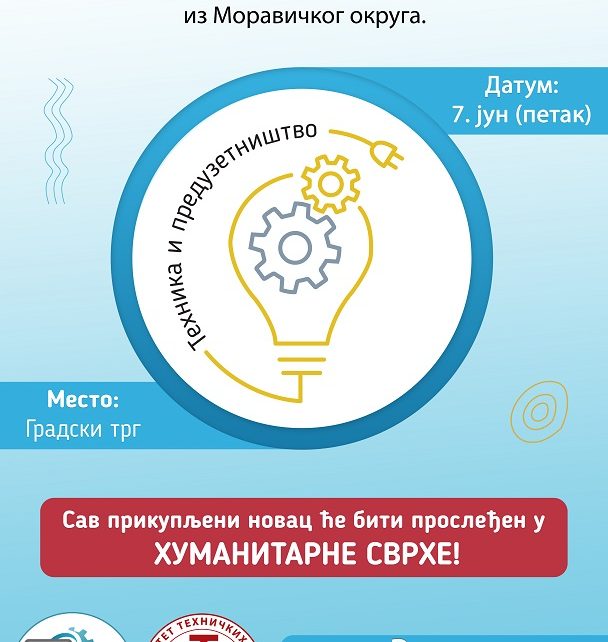 У организацији Удружење професора информатике и технике „УПИТ“ и Факултета Техничких Наука у Чачку данас ће на Градском тргу у Чачку, од 16 до 20 часова, бити одржана Хуманитарна изложба „Техника и предузетништво Моравичког округа“. Ово је четврта годину за редом како се изложба организује , а све у циљу прикупљања средстава за помоћ угроженој деци по […]