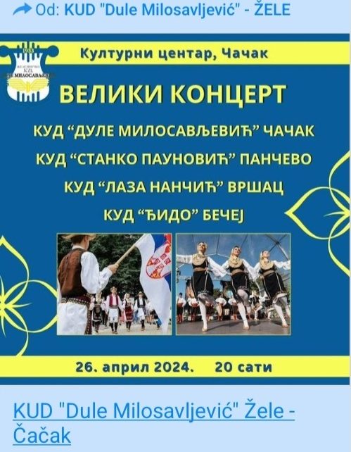 ВЕЛИКИ КОНЦЕРТ ФОЛКЛОРИСТА У Културном центру Чачак, у петак, 26. априла, у 20 часова, биће одржан велики концерт фолклориста културно-уметничких друштава “Дуле Милосављевић”, “Станко Пауновић” Панчево, “Лаза Нанчић” Вршац и “Ђидо” Бечеј. На великој сцени КЦ наступиће око 400 извођача, а љубитељи фолклора уживаће у играма из свих крајева Србије. Карте могу да се купе […]
