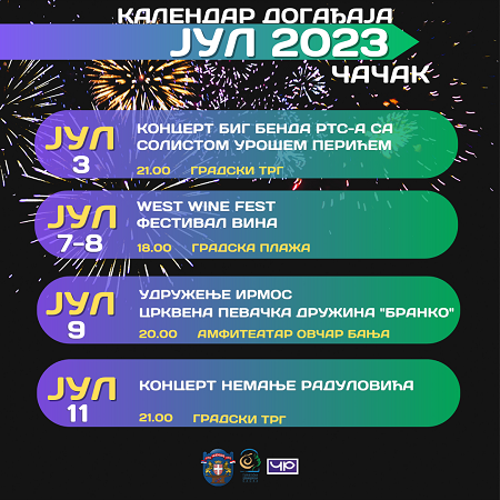 Град Чачак ће током јула месеца имати изузетно садржајан и богат програм. Концерти и манифестације одржавају се по редовном програму и календару ТО Чачка и у оквиру програма националне престонице културе „Чачанска родна“. – Такође, очекује нас неколико великих летњих концерата различитих жанрова, навели су из ТОЧ-а. Већ у првој седмици, у понедељак, 3. јула, […]