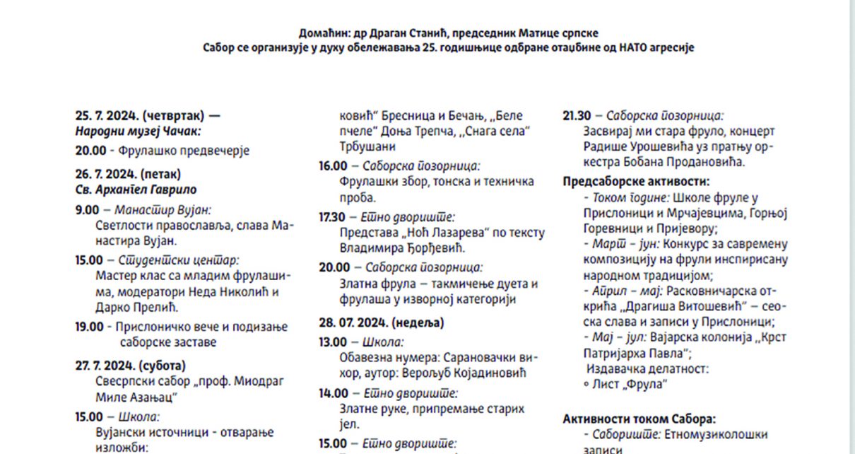 Обавештење о реду вожње аутобуса на релацији Чачак – Прислоница за време трајања 37. Сабора фрулаша У суботу, 27. 7. 2024. године испред Гимназије, аутобуси за Прислоницу крећу у 12, 14 и 17 часова. Повратак за Чачак из Прислонице предвиђен је у 12.30, 14.30 и након завршетка програма на Сабору фрулаша. У недељу, 28. 7. […]