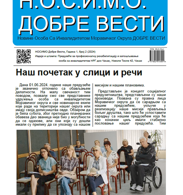 УСКОРО ДРУГИ БРОЈ ЛИСТА “НОСИМО ДОБРЕ ВЕСТИ” ПОСВЕЋЕН ОСОБАМА СА ИНВАЛИДИТЕТОМ Предузеће за професионалну рехабилитацију и запошљавање особа са инвалидитетом НРГ из Чачка, чији је циљ стварање инклузивнијег амбијента за особе са инвалидитетом, поред основне делатности, издавач је и штампаног медија “НОСИМО Добре Вести”. Други број новина, које су посвећене активностима свих удружења особа са […]