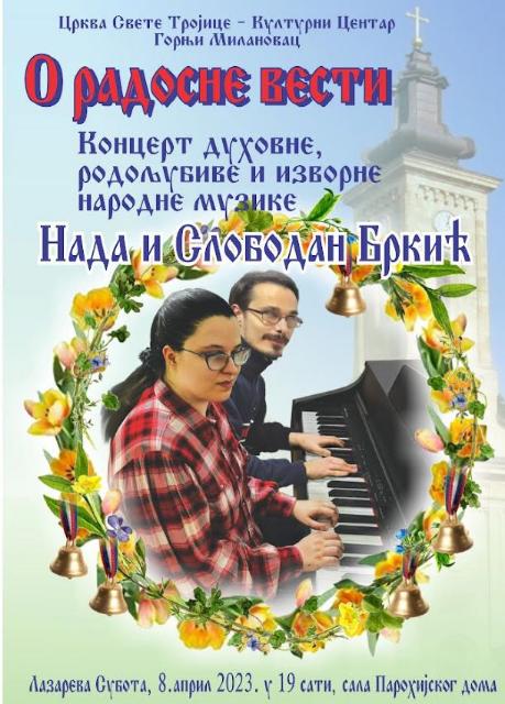Извор: Кабинет Културни центар Горњи Милановац Црква „Свете Тројице“ и Културни центар Горњи Милановац организују у суботу, 8. априла 2023. године у сали Парохијског дома концерт духовне, родољубиве и изворне народне музике назива „О радосне вести“. Концерт ће одржати Нада и Слободан Бркић. Почетак програма је у 19 сати.