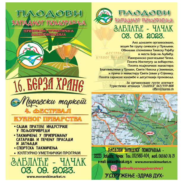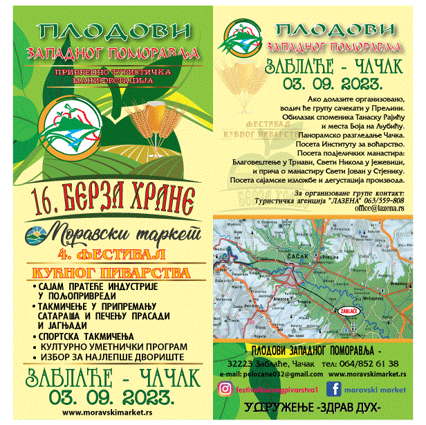 У НЕДЕЉУ, 3. СЕПТЕМБРА, „ПЛОДОВИ ЗАПАДНОГ ПОМОРАВЉА“ У ЗАБЛАЋУ „БЕРЗА ХРАНЕ“ – ОКОСНИЦА МАНИФЕСТАЦИЈЕ У недељу, 3. септембра, у Заблаћу код Чачка, у црквеној порти, биће одржана 16. по реду привредно-туристичка и културно-забавна манифестација „Плодови западног Поморавља“, која из године у годину окупља све већи број посетилаца. Свечано отварање манифестације биће уприличино у 11 сати. […]