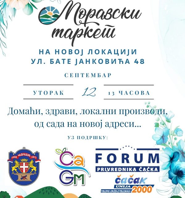 „Моравски маркет“ пресељен је на нову адресу у Улици Бате Јанковића бр. 48. Тим поводом биће обележено отварање на новој локацији у уторак 12. септембра, са почетком у 13 часова. Планирана је дегустација домаћих производа од локалних произвођача који своје производе излажу у „Моравком маркету“. Више о производима на www.moravskimarket.rs