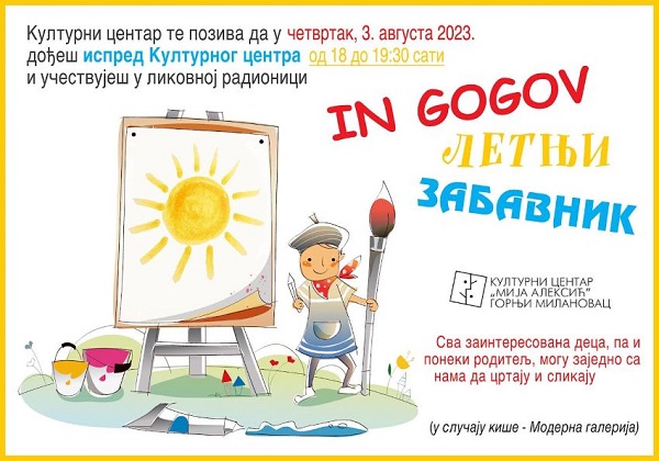За малишане Горњег Милановца и њихове родитеље, Културни центар „Мија Алексић“ организује у четвртак, 3. августа 2023. године, од 18 сати, на платоу испред Старог суда ликовну радионицу назива „Ин Гогов летњи забавник“. Почетак радионице је у 18 сати. У случају кише програм ће бити реализован у Модерној галерији. Извор: Културни центар Горњи Милановац