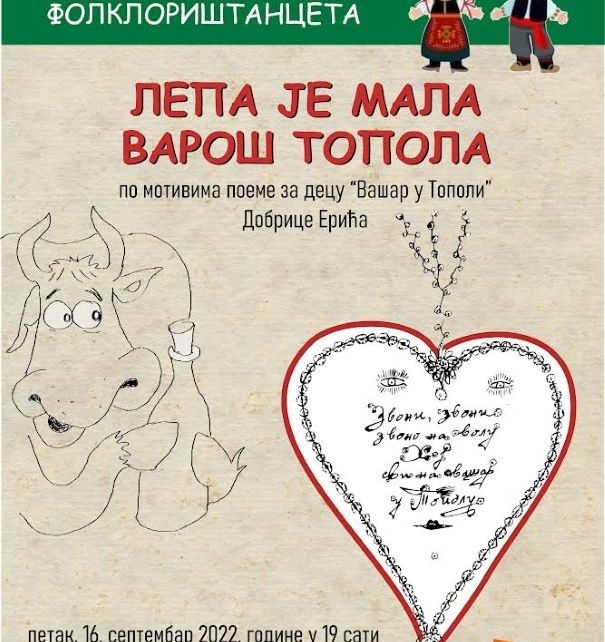 Концерт „Лепа је мала варош Топола“ урађен по мотивима поеме за децу „Вашар у Тополи“ Добрице Ерића, Фолклориштанце ће одржати у петак, 16. септембра. Почетак концерта је у 19 сати, а цена улазнице 200 динара. Куповина и резервација улазница у Културном центру Горњи Милановац.
