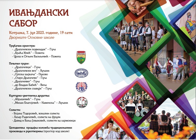 ИВАЊДАНСКИ САБОР У КОТРАЖИ петак, 7. јул од 19 сати ( двориште ОШ „Котража“) Још једна традиционална манифестација у Драгачеву, одржаће се овог петка. У драгачевском селу Котража одржаће се Ивањдански сабор са богатим културно-уметничким програмом. Ред песме, ред игре, ред традиције коју чувамо и негујемо већ годинама, деценијама уназад. Учесници у програму: Трубачки оркестри: […]