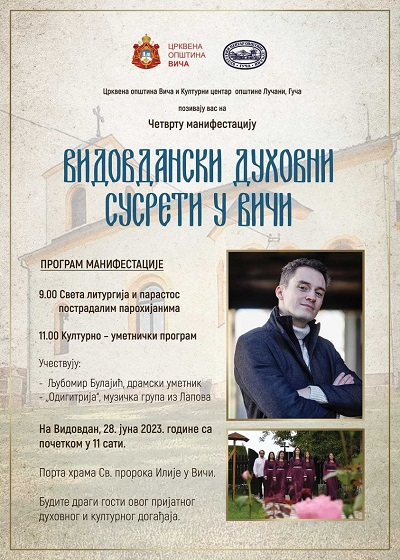 Црквена општина Вича и Културни центар општине Лучани, Гуча биће организатори манифестације „ВИДОВДАНСКИ ДУХОВНИ СУСРЕТИ“ на Видовдан, 28. јуна, у порти храма у Вичи. Манифестација отпочиње Светом литургијом и парастосом страдалим парохијанима у 9.00 часова. Након Литургије, у 11.00 часова почиње Културно-уметнички програм у којем учествују Љубомир Булајић, драмски уметник и „Одигитрија“, музичка група из […]