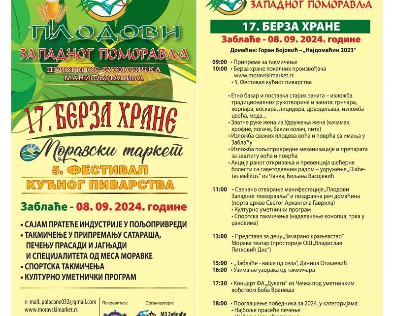 У Моравском маркету, данас је одржана конференција за медије на којој је представљен програм привредно-туристичке манифестације „Плодови западног поморавља“ која ће у недељу 8. септембар бити одржана у чачанском селу Заблаће. – Ове године се окупљамо 17. пут да представимо своје производе и да се дружимо. Ту ће бити редовних излагача из Чачка, Горњег Милановца […]