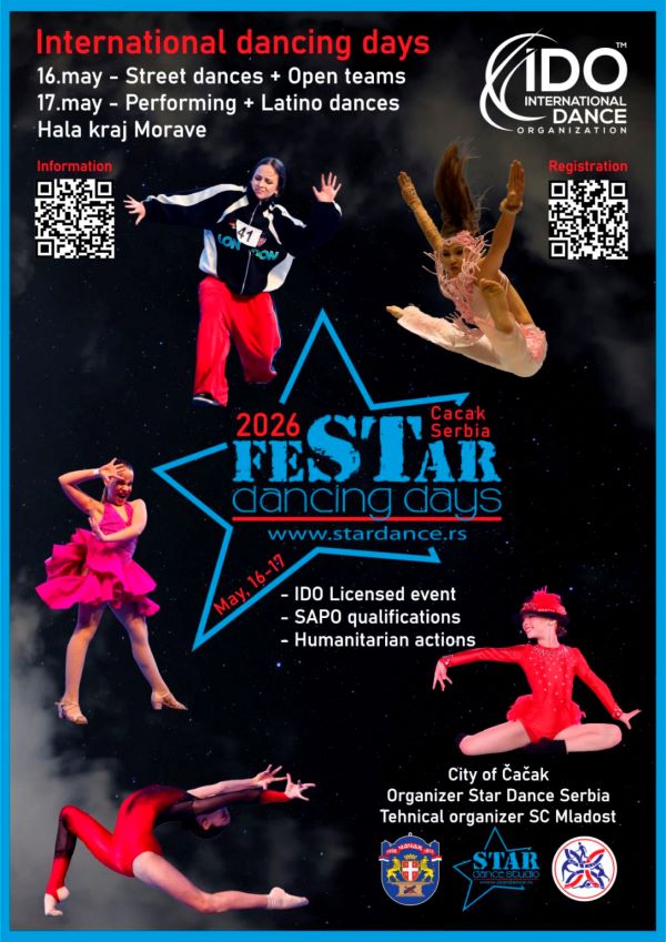 Плесни студио Star Dance ће, 16. и 17. маја, уз подршку Града Чачка и Спортског центра Младост“, у Кошаркашкој хали крај Мораве, организовати 3. Међународни плесни фестивал – feSTAR Dancing Days, лиценциран од Интернационалне плесне организације. Поред такмичарског дела у street и performing плесовима, биће одржане и квалификације наших најбољих плесача за интернационална плесна такмичења.