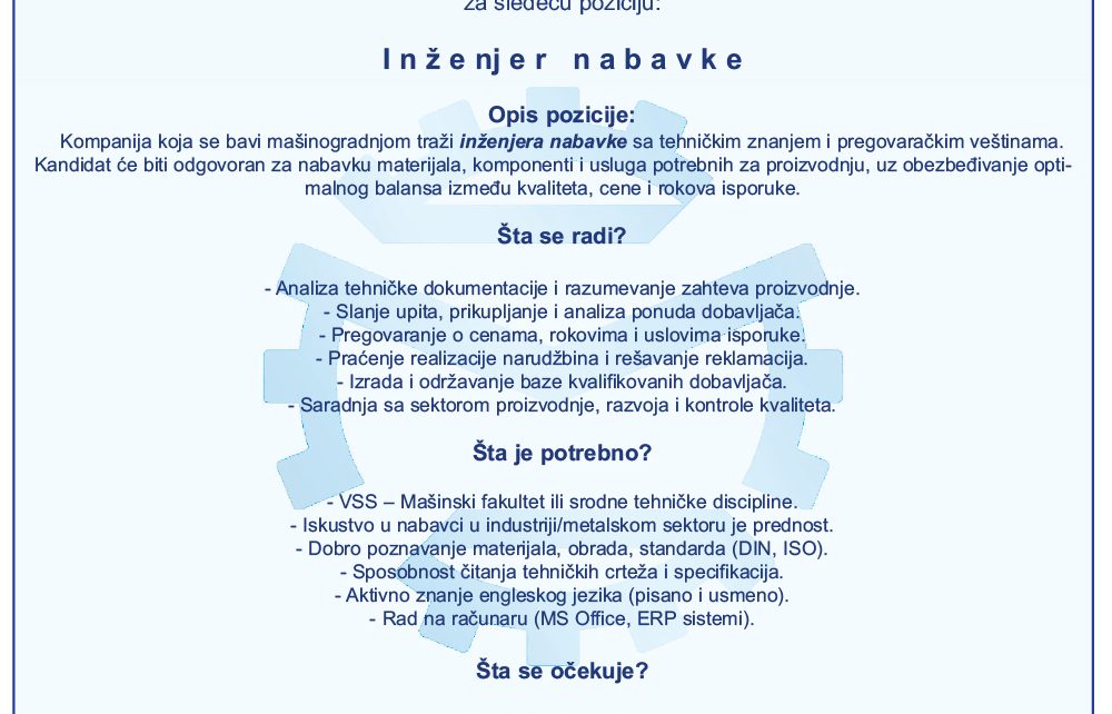 „EURIMASHINE“: Potreban inženjer nabavke