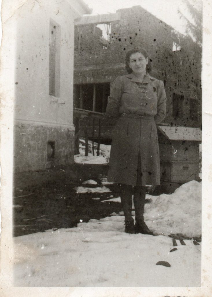 Љубица Гавриловић, супруга оснивача Института, у позадини се види објекат у изградњи, вероватно 1946. година