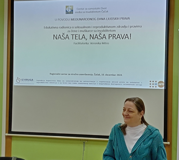 – Ми „Из КРУГА Војводина“ и Популационог фонда УН, у сарадњи са Центром за самостални живот особа са инвалидитетом Чачак, одлучили смо да се, баш на Међународни дан људских права, подсетимо наших репродуктивних и сексуалних права, јер у Агенди инвалидности ова права су често на последњем месту или уопште нису наведена, као и родно засновано насиље над женама са инвалидитетом. Најчешће се и даље говори о приступачности, мада смо сведоци да многе, чак и јавне институције, нису ни архитектонски, ни комуникацијски приступачне. О сексуалним и репродуктивним правима се готово не говори, што је, такође, стереотип, не само у широј заједници, већ и међу стручњацима. И даље се сматра да смо ми нека вечита деца, о којима је увек потребно да се неко брине, да се не можемо остварити у улози партнера, супружника, родитеља, па самим тим, ове теме за нас нису ни важне. Нема ни саветовалишта, нити информација у форматима приступачним за слепе, глуве или особе са интелектуалним и психичким сметњама, гинеколошке и акушерске установе нису физички приступачне… Тако смо, практично, и даље искључени – набраја Вероника Митро и наводи да су за особе са инвалидитетом готово мисаоне именице програми вантелесне оплодње и сурогат мајчинства, а веома тешко су им приступачни превентивни гинеколошки и мобилни мамографски прегледи.