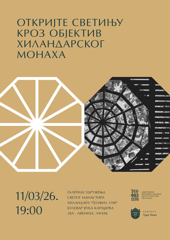 Среда, 11. март, Удружење Светог Манастира Хиландар „Теофил 1198“, Булевар Вука Караџића 38 А, Чачак. Изложба „Откријте светињу кроз објектив хиландарског монаха“. Отварање изложбе у 19 часова.