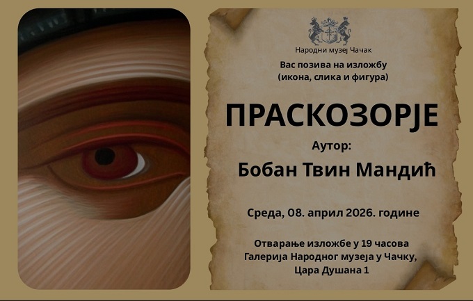 Изложба „ПРАСКОЗОРЈЕ“, aутора Бобана Твин Мандића, ће бити отворена у среду, 8. априла, у 19 сати, у Галерији Народног музеја у Чачку.