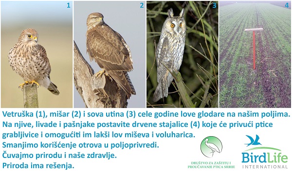 – Као и остале мање грабљивице, мишари могу донети велику корист пољопривредницима, јер је он главни непријатељ глодара. На нивоу Србије добит се мери стотинама хиљада евра, само у приносима, а да не говоримо о новцу за препарате за тровање глодара, од којих и ми имамо штете – каже Петровић и саветује пољопривредницима постављање стајалица на њивама, ливадама и пашњацима, како то већ чине у Војводини. То су обичне летве или дебље гране на висини од метар и по до два, на педесетак метара раздаљине, где преко дана „стражаре“ и одакле лове мишари и ветрушке, а исте осматрачнице ноћу користе сове.