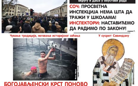 АКТУЕЛНО: Већина школа у Моравичком округу и даље у обустави рада – СОЧ: ПРОСВЕТНА ИНСПЕКЦИЈА НЕМА ШТА ДА ТРАЖИ У ШКОЛАМА! ИНСПЕКТОРИ: НАСТАВИЋЕМО ДА РАДИМО ПО ЗАКОНУ! Чување традиције, неговање историјског сећања – БОГОЈАВЉЕНСКИ КРСТ У РУКАМА ЈОВАНА КЕЦОВИЋА У сусрет Савиндану – СВЕТИ САВА – ЖИВОТ ПО ЈЕВАНЂЕЉУ Чачанин БОЈАН ЋИРОВИЋ, учесник кулинарске емисије […]