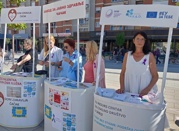 Једна од најчешћих заблуда је да старост сама по себи значи деменцију. А заборавност је само једна од њених одлика. Нема прецизних података о броју особа са деменцијом у Србији. Према проценама, око 140.000 особа у нашој земљи је оболело од неког облика демеције, а чак код 75 одсто болест није дијагностикована. Највећи терет подноси породица која често, у потрази за решењима, „лута“ од врата до врата здравствених и социјалних служби. Многи се одлуче на „ћутање“, сами се носе са проблемима. Деменција изазвана Алцхајмеровом болешћу је њен најчешћи вид. Поводом 21. септембра, Светског дана борбе против Алцхајмерове болести, данас је у центру града одржана акција у организацији Чачанског удружења дементних особа – Ч.У.Д.О. Грађани су имали прилику да сазнају који су први симптоми деменције и како помоћи особи са деменцијом. Акцију су подржали Друштво за борбу против шећерне болести „Diabetes mellitus“, Завод за јавно здравље и Поливалентна патронажна служба Дома здравља.