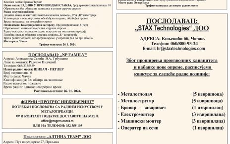 ПОСЛОДАВАЦ: „ДОМИНГО“ ДОО АДРЕСА: Николе Тесле бб, Чачак Телефон: 032/5573-310,063-618-770 Е–маil: domingocacak@gmail.com Лице за контакт: Марковић Александар Назив и опис посла: ПРОДАВАЦ Број тражених извршилаца: 2 (два) Образовање: III или IV степен стручне спреме, без обзира на занимање Посебна знања и вештине: возачка дозвола „Б“ категорије, познавање рада на рачунару Радно искуство: […]