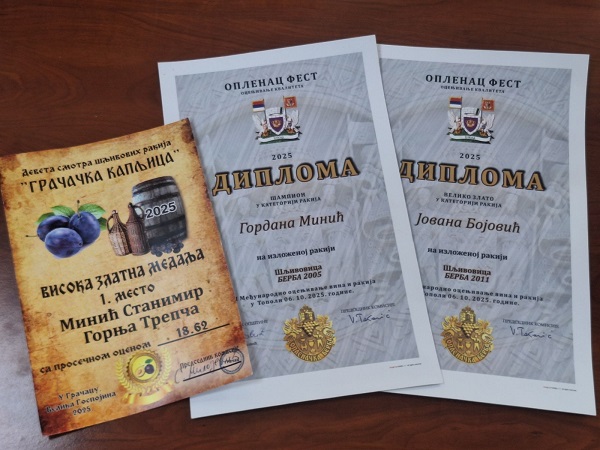 Иначе, шљивовица из „Минићеве куће ракије“ са освојених 19.10 поена понела је ове године престижну шампионску титулу Међународног фестивала ракија „Горње Подунавље 2025“, одржаног 14. јуна у Апатину.На истом такмичењу, прво место је припало Јовани Бојовић, унуци Станимира Минића, за шљивовицу из 2019. године, која је добила оцену 18.75. „Минићева кућа ракије“ је била успешна и у категорији такмичења резервисаној за даме произвођаче, где је међу 36 узорака победила шампионска шљивовица Гордане Минић из 2004. године (оцењена са 19.10), освојивши специјалну награду, чувену „ајкулу“, од Удружења произвођача и љубитеља воћних ракија „Чувари традиције“ Апатин.