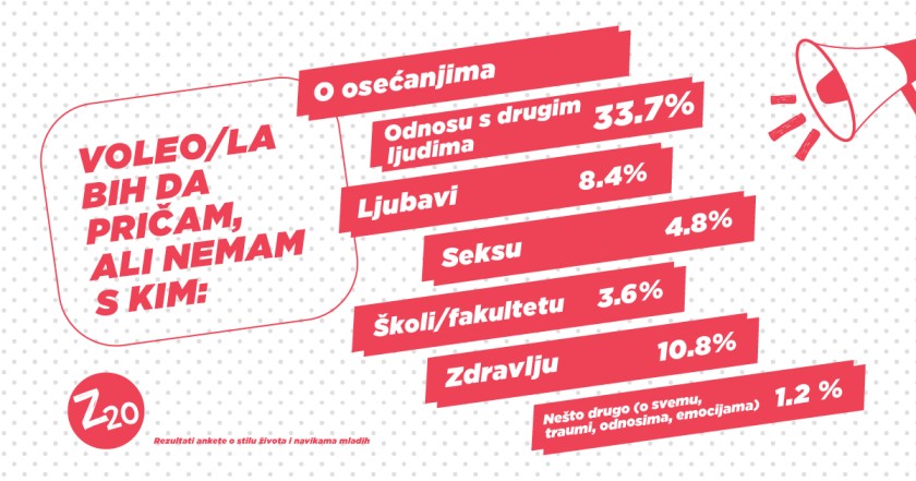 Anketa je pokazala i da 30 odsto njih voli da priča o osećanjima, ali nema s kim da ih podeli, dok bi skoro 34 odsto volelo da razgovara o odnosima sa drugim ljudima. Zanimljiv je i podatak da je za skoro 29 odsto ispitanika najveća vrednost posvećenost, dok je za 18 odsto najvažnija vrednost sloboda.