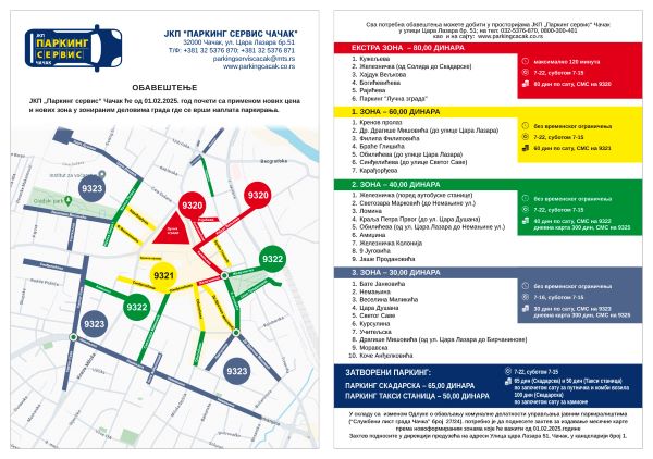 – И даље је цена паркирања у трећој зони најјефтинија у Србији, само 30 динара и наплаћује се до 16 часова, а након тога је паркирање бесплатно. И цена станарске карте у трећој зони је такође повољна, 800 динара на месечном нивоу. Презонирањем смо направили коректну расподелу паркинга, око 40 одсто је у трећој зони, а по 20 процената у екстра, првој и другој зони. Познато је да корисници услуга имају више могућности за плаћање паркинга. Поред СМС наплате, аутоматске наплате паркирања на затвореним паркиралиштима, паркинг – греб картице, возачи могу платити путем апликације за плаћање паркинга СМС-ом, као и код контролора на терену. Уколико неко од корисника није платио паркинг, после десет минута од паркирања, контролори издају посебну дневну карту. Цена посебне дневне паркинг карте, уместо досадашњих 1.200 динара, износи 1.500 динара. Уколико возач у року од осам дана плати, цена посебне дневне карте биће умањена за 50 одсто. Од тренутка постављања посебне дневне карте на возило, у току наредна 24 сата, возач има право на бесплатно паркирање у граду, у свим зонама, изузев затвореног паркинга – подсећа Зоран Благојевић.