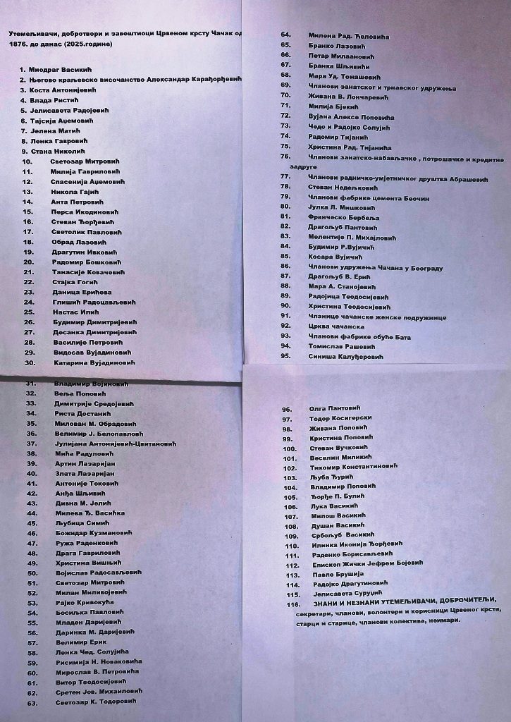 – Молитва за упокојене, коју је служио чачански свештеник, протојереј Мирко Мандић, није била само тренутак духовног сећања, већ и симболички позив за наставал традиције хуманости, пожртвованости и љубави према човеку. „Аманет” да се сећамо упокојених оставили су нам велики добротвори Миодраг Васикић, који је 1932. године поклонио плац на коме се налази зграда Црвеног крста и Раденка Борисављевића из Атенице. Борисављевић нам је оставио „аманет” и да славимо Свете Козму и Дамјана – подсећа Наташа Цвијовић, секретар Црвеног крста Чачак.