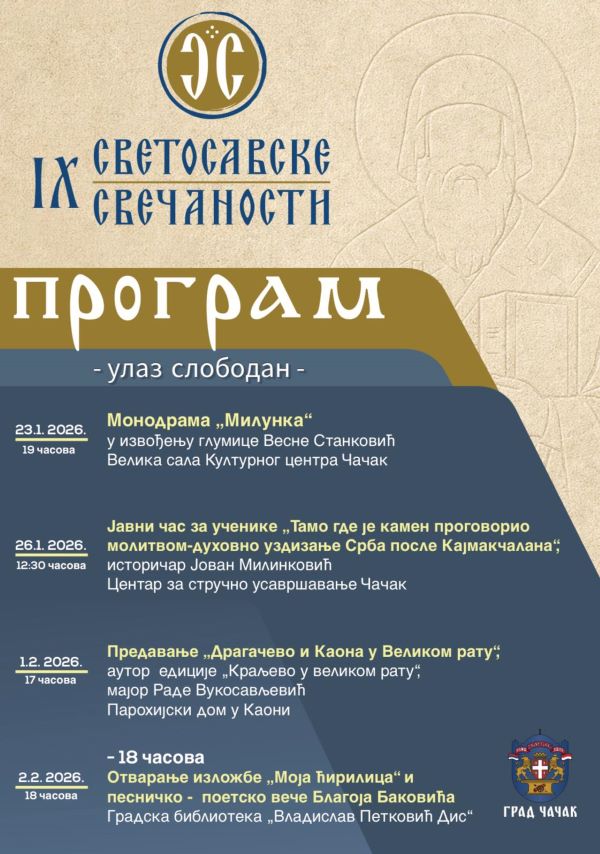– Када је реч о деветој годишњој манифестацији „Светосавске свечаности“ главни мотив је Србија, односно, чачански крај у Првом светском рату. У оквиру манифестације биће реализована четири програма и за све је улаз слободан. Заинтересовани грађани улазнице могу преузети на билетарници Културног центра – нагласио је Ђуро Церанић, председник Удружења „Светосавске свечаности“.