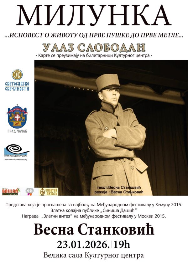 Позоришном представом „Милунка“ у част наше славне хероине из Првог светског рата Милунке Савић, која ће бити изведена у Великој сали Културног центра, у петак 23. јануара, у 19 часова, почеће 9. „Светосавске свечаности“. Реч је о монодрами коју игра Весна Станковић, наша позната глумица, најавио је заменик градоначелника Владан Милић, позивајући суграђане да се подсете дивног лика и дела Милунке Савић. Милић је подсетио да Град Чачак подржава све манифестације и удружења који негују нашу традицију, а „Светосавске свечаности“ управо баштине такве вредности.