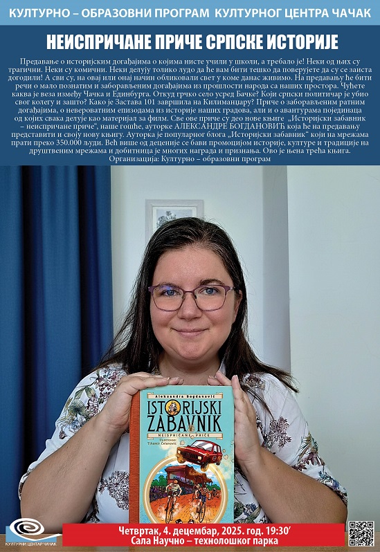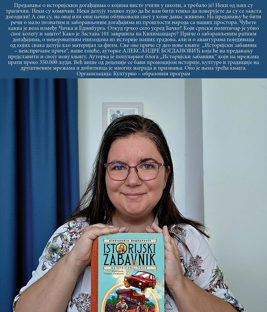 Предавање о историјским догађајима о којима нисте учили у школи, а требало је! Неки од њих су трагични. Неки су комични. Неки делују толико лудо да ће вам бити тешко да поверујете да су се заиста догодили! А сви су, на овај или онај начин обликовали свет у коме данас живимо. На предавању ће бити речи о мало познатим и заборављеним догађајима из прошлости народа са наших простора. Чућете каква је веза између Чачка и Единбурга. Откуд грчко село усред Бачке? Који српски политичар је убио свог колегу и зашто? Како је Застава 101 завршила на Килиманџару? Приче о заборављеним ратним догађајима, о невероватним епизодама из историје наших градова, али и о авантурама појединаца од којих свака делује као материјал за филм. Све ове приче су део нове књиге  „Историјски забавник – неиспричане приче“, наше гошће, ауторке АЛЕКСАНДРЕ БОГДАНОВИЋ која ће на предавању представити и своју нову књигу. Ауторка је популарног блога „Историјски забавник“ који на мрежама прати преко 350.000 људи. Већ више од деценије се бави промоцијом историје, културе и традиције на друштвеним мрежама и добитница је многих награда и признања. Ово је њена трећа књига.
