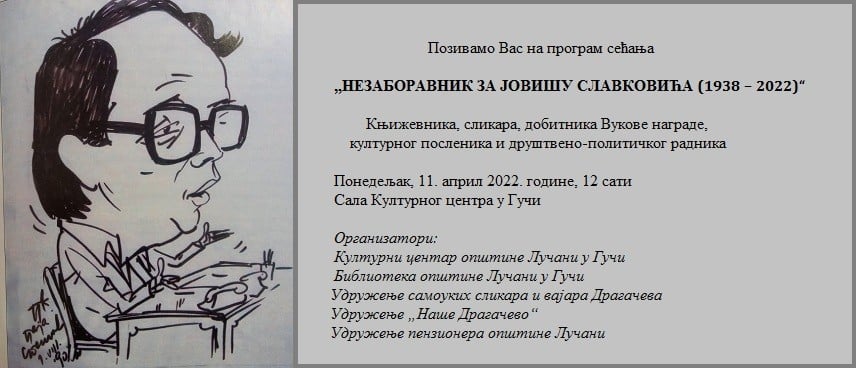 У Културном центру у Гучи, у понедељак, 11. априла, у 12 сати, биће уприличин програм сећања на Јовишу М. Славковића, књижевника, сликара, добитника Вукове награде, културног посленика и друштвено – политичког радника.