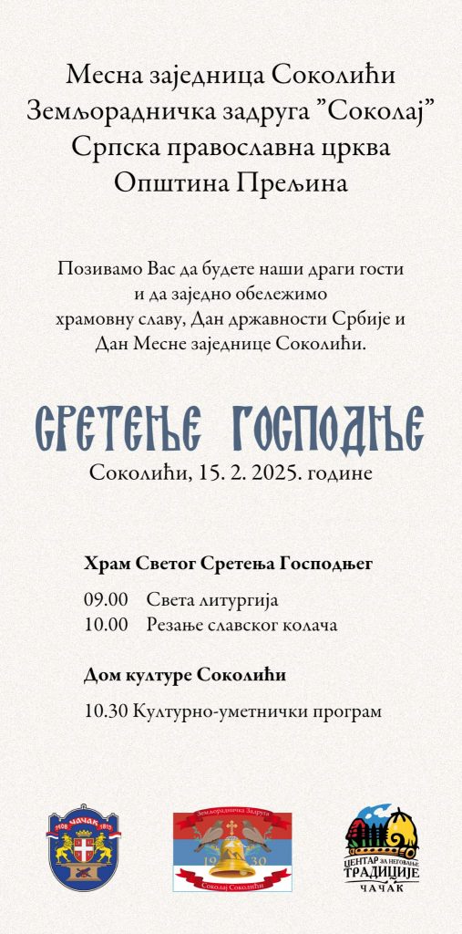 Након празничне литургије, у Дому културе у Соколићима одржаће се културно – уметнички програм који ће обиловати музичко-сценским наступима фрулаша, гуслара и културно уметничког друштва.