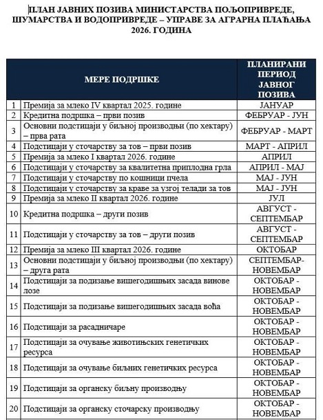 Министарство пољопривреде, шумарства и водопривреде Владе Републике Србије објавило је почетком фебруара календар свих подстицаја за 2026. годину, чиме је, како се наводи, испуњено једно од кључних обећања датих пољопривредницима да аграрна политика буде предвидљива, јасна и усклађена са реалним потребама производње. У саопштењу Министарства се истиче да је објављивањем јединственог плана јавних позива пољопривредницима први пут омогућено да унапред знају када могу да очекују одређене мере подршке.