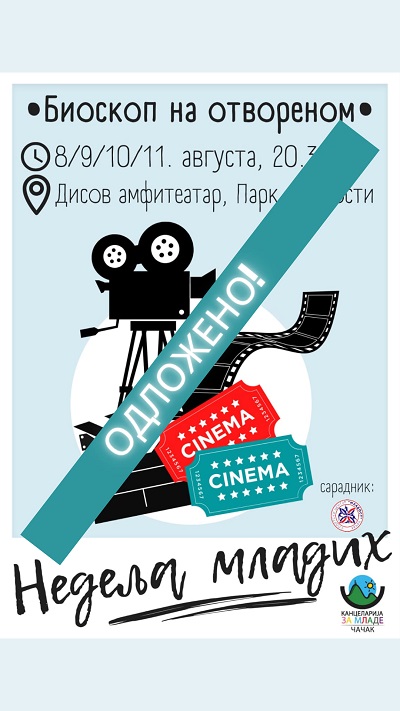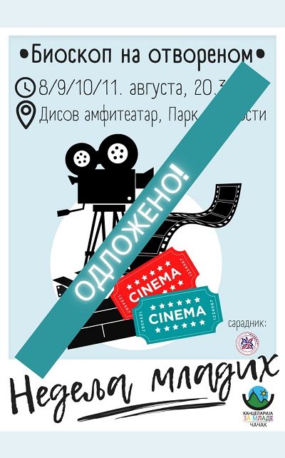 Због најављених падавина током вечери, одложено је филмско вече Биоскоп на отвореном, који у оквиру Недеље младих, организује Канцеларија за младе, а нови термин биће накнадно објављен.