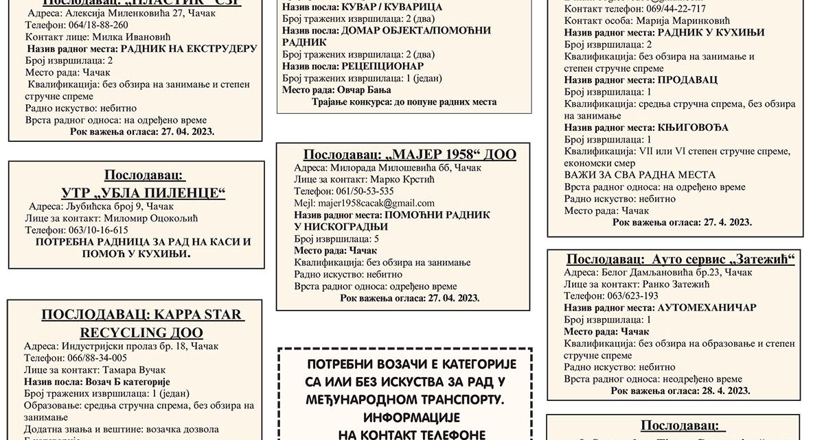 POSLODAVAC: „Eldisy Serbia“ DOOADRESA: Preljina,ČačakE-mail: karriere@vorwerk-automotive.rs Naziv i opis posla: Operater u proizvodnjiBroj traženih izvršilaca: 35 (trideset pet) Obrazovanje: srednja stručna sprema, bez obzira na zanimanje Radno iskustvo: poželjno na navedenim poslovima Uslovi rada: rad u smenama, noćni rad Vrsta zaposlenja: na neodređeno vreme Mesto rada: Preljina, Čačak Trajanje konkursa: 13.09.2020. Zainteresovani kandidati svoje radne […]