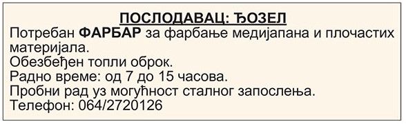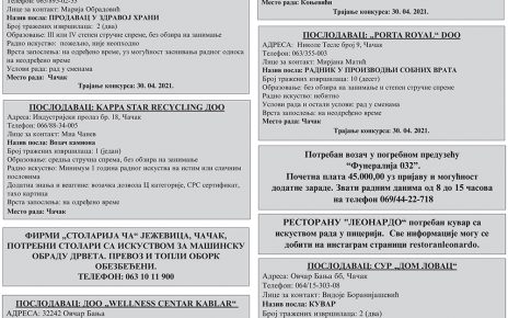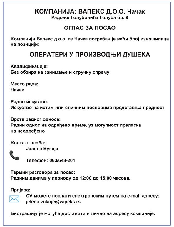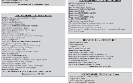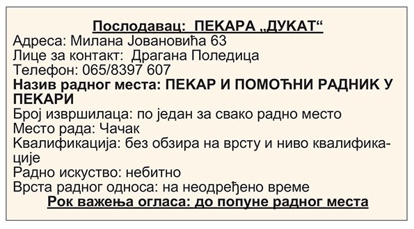 ПОСЛОДАВАЦ: ЗУ „MELEM- PHARM“ АДРЕСА: Лучани, ЈА бр. 10 Телефон: 060/380-7014 Лице за контакт: Стакић Мирослава Назив посла: ФАРМАЦЕУТСКИ ТЕХНИЧАР Број тражених извршилаца: 2 (два) Опис посла:рад у апотеци Образовање: IV степен стручне спреме, фармацеутски техничар Посебна знања и вештине: положен стручни испит; познавање рада на рачунару Радно искуство: небитно Врста […]